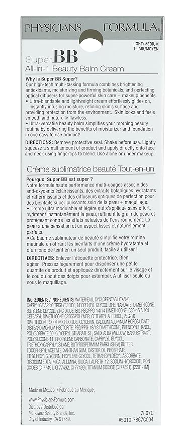 Physicians Formula Super BB Cream. All in 1 Tinted Beauty Balm Foundation Cream, Sheer Moisturizing Coverage, Cruelty Free Light/Medium
