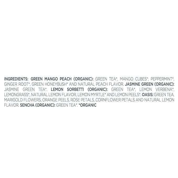 - GREEN TEA ASSORTMENT with the finest quality green tea leaves, blended with fruits, flowers and herbs: Green Mango Peach, Jasmine green, Lemon Sorbetti, Oasis and Sencha.