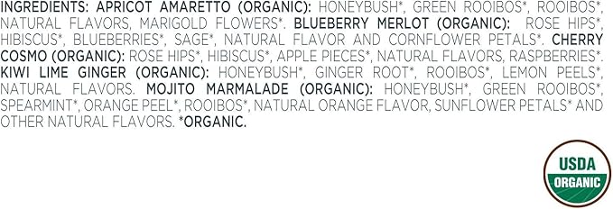 - HERBAL RETREAT COLLECTION with five varieties of relaxing herbal tea blends - Apricot Amaretto, Blueberry Merlot, Cherry Cosmo, Kiwi Lime Ginger, Mojito Marmalade.
