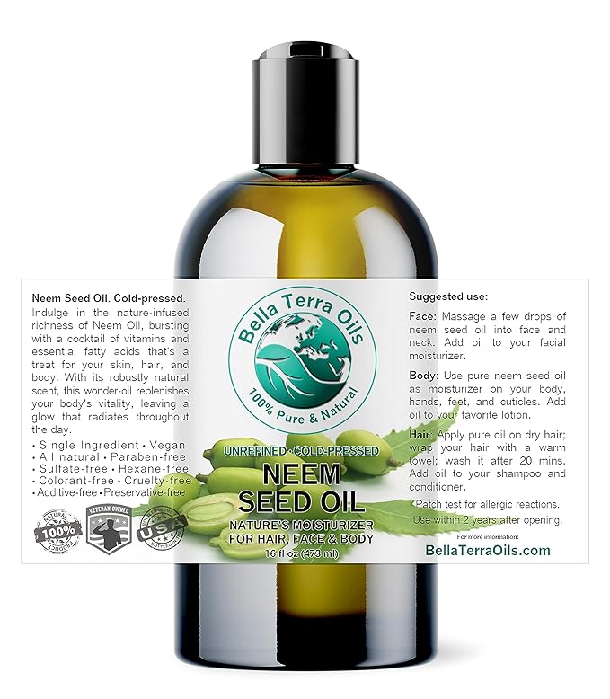 Bella Terra Oils - Organic Neem Seed Oil 16 oz - Authentic Cold-Pressed Process, Filled with Palmitic Acid & Omega-9 Fatty Acids, Ideal for Daily Skin Routine