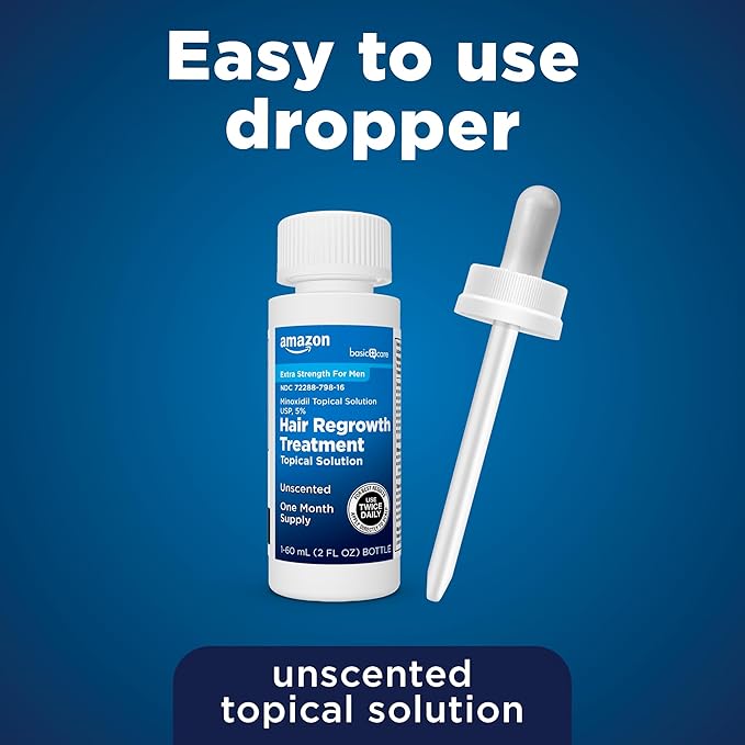 - EXTRA STRENGTH: Amazon Basic Care Minoxidil Topical Solution USP, 5 Percent is an extra strength solution for men to help regrow hair; includes an easy to use dropper