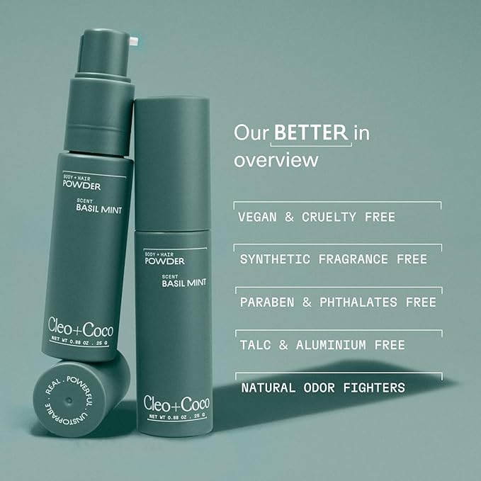Cleo + Coco. Deodorant Powder for Body and Hair, Basil Mint (0.88 oz), 2-in-1 Deo Powder & Dry Shampoo for Women & Men, Aluminum Free Deodorant, Talc-Free, Anti Chafe Protector, Travel-Size