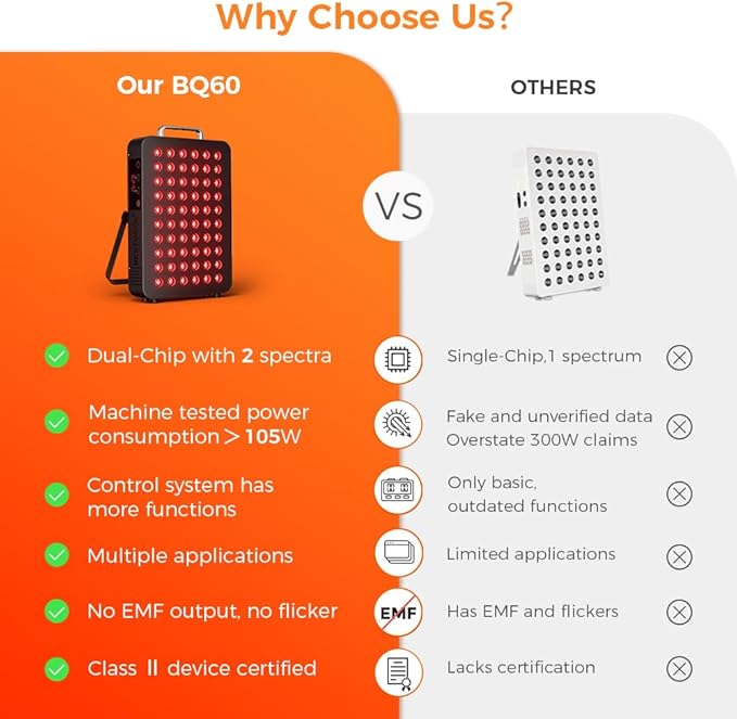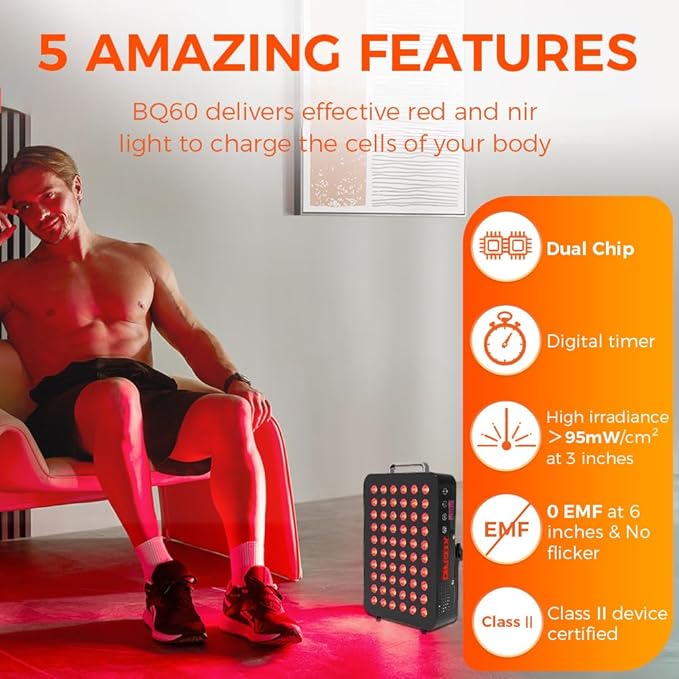 - Durable, Hands-free Design: BQ60 dual-chip red light panel comes as a full package, includes user manual, hanging kit, and eye protection, complete with a built-in cooling fan to dissipate heat. The light therapy can be placed on a table or hung on the wall, providing a 17.2" x 11.8" therapy area at a 6-inch distance. Get the healthy benefits while you are working, relaxing or lying down.