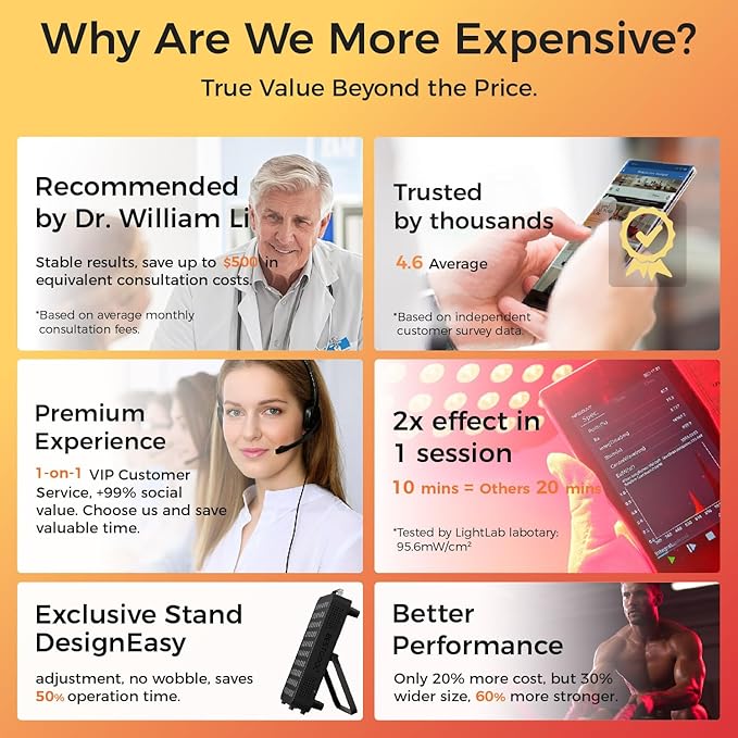 - Say Goodbye To Expensive Spa: Saving numerous time and money to regain healthy mind & body at home. 10 minutes of irradiation with our red light therapy is equal to 20 minutes of other devices. An easy way to optimize collagen production and improve workout recovery without the effort. Light is as essential to cells as food is to people. With 30 days return policy, if you never try, you'll never know!