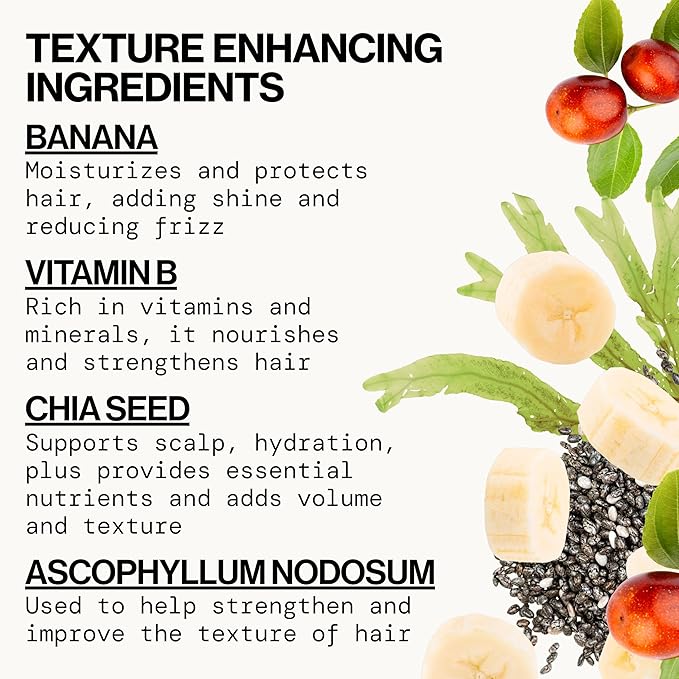 - BANANA & VITAMIN B FOR MOISTURE – Enriched with banana and pro-vitamin B5 to keep hair hydrated and shiny. Banana is rich in potassium and helps add moisture and elasticity to prevent the dryness often associated with texturizing products. Pro-Vitamin B5 (panthenol) penetrates to improve hair’s moisture retention and sheen. These ingredients ensure your waves stay soft and won’t get stiff or frizzy – you get texture plus smoothness. Hair looks naturally beachy with a healthy, subtle shine.