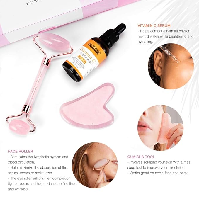 - PERFECT COMBINATION: 3 in 1 facial massage beauty tool set-Give your skin a boost and relax with the stimulating gentle massage of the natural stone jade facial roller and Gua Sha Tool, while combination serum-a unique blend of vitamins nourishes and protects your skin.