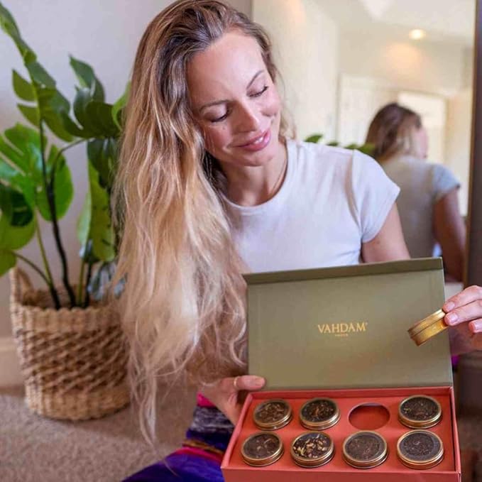 - EMBRACE THE MAJESTY OF TAJ MAHAL - Elevate gifting with our Taj Mahal-inspired Loose Leaf Tea Gift Set. Immerse yourself in 9 preservative-free blends, capturing the grandeur of this iconic monument. Indulge in the aromatic Sweet Cinnamon Masala Chai, vibrant Turmeric Spiced Herbal Tea, classic Original Chai Spiced Black Tea, rich Saffron Chai Spiced Black Tea, warm Ginger Chai Spiced Black Tea, bold Assam Exotic Summer Black Tea, Daily Darjeeling SF Black Tea and Vanilla Chai Spiced Black Tea. Elegantly presented in luxurious gold tin caddies within a premium gift box adorned with intricate Taj Mahal motifs, this collection is a perfect tribute to the splendor of India.