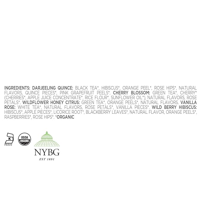 - Diverse Flavors - From only the finest whole tea leaves in the world, blended with aromatic fruits, spices and herbs, this sampler has 10 assorted pyramid tea infusers - Darjeeling Quince (black tea), Cherry Blossom (green tea), Wildflower Honey Citrus (green tea), Vanilla Rose (white tea), Wildberry Hibiscus (herbal tea).