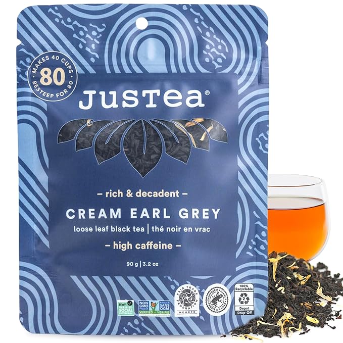 JusTea CREAM EARL GREY | Loose Leaf Black Tea | Recyclable Refill Pouch | 40+ Cups (3.2oz) | High Caffeine | Award-Winning | Fair Trade | Non-GMO