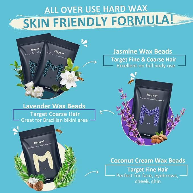 - MULTI FORMULA WAX BEADS KIT: Including 4 bags different formula wax refill for all kinds of hair and all skin types. You can remove everything from thick coarse to fine hairs, and even short, shaved hairs. 1×cream wax for eyebrows, face, upper lip, chin , 1×lavender wax for bikini area, 2×jasmine blue wax for back, arms, underarms, legs, especially for coarse hair waxing.