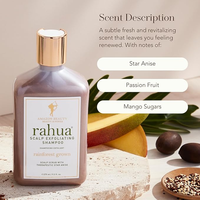 - GENTLE EXFOLIATING INGREDIENTS: Featuring aromatic crushed Star Anise as a gentle, tactile exfoliant along with superfruit enzymes of Organic Mango and Passion Fruit. Rahua Exfoliating Scalp Shampoo is a gentle plant-powered scrub and natural, nourishing peel for a purifying exfoliation experience for the scalp.