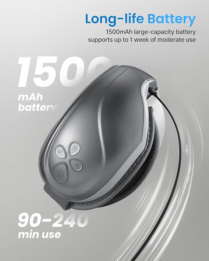 - User-Friendly Design: Comes with the physical buttons for Power/Mode, Compression, Heat, and Music/Volume allowing you to easily adjust the settings you love most. A heightened nose bridge design reduces the pressure applied to the nose. The strap is adjustable so that it can easily fit any head size regardless of the age of the user. The soft and breathable leather inner lining allows for easy wipe-cleaning with just a piece of cloth.