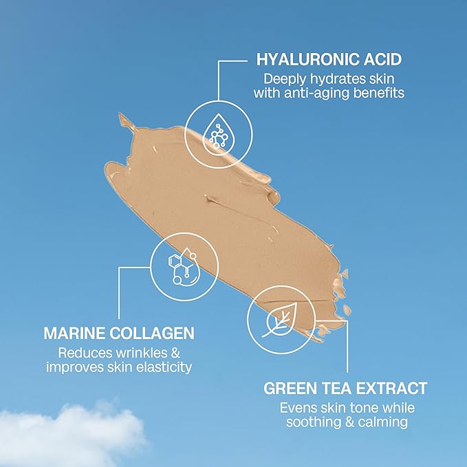 - ENRICHED WITH SKINCARE INGREDIENTS Enriched with green tea, hyaluronic acid and marine collagen to rejuvenate and renew the skin. It's lighter than a foundation but provides more coverage and benefits than a tinted moisturiser.