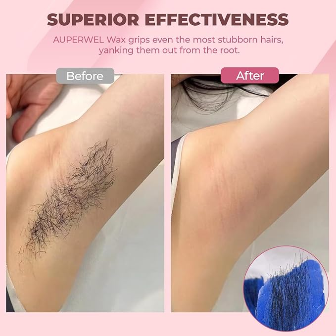 - Effective Hair Removal Result: Whether you believe it or not, our wax beans for hair removal are born to remove both coarse and fine hair. Auperwel wax beads for brazilian waxing have no issues getting 90% of hair whether it's the thin stuff on your upper leg or the more stubborn hairs on the bikini area. It hugs EVERY hair securely to pull them from the root and enjoy 3-6 weeks of flawless!