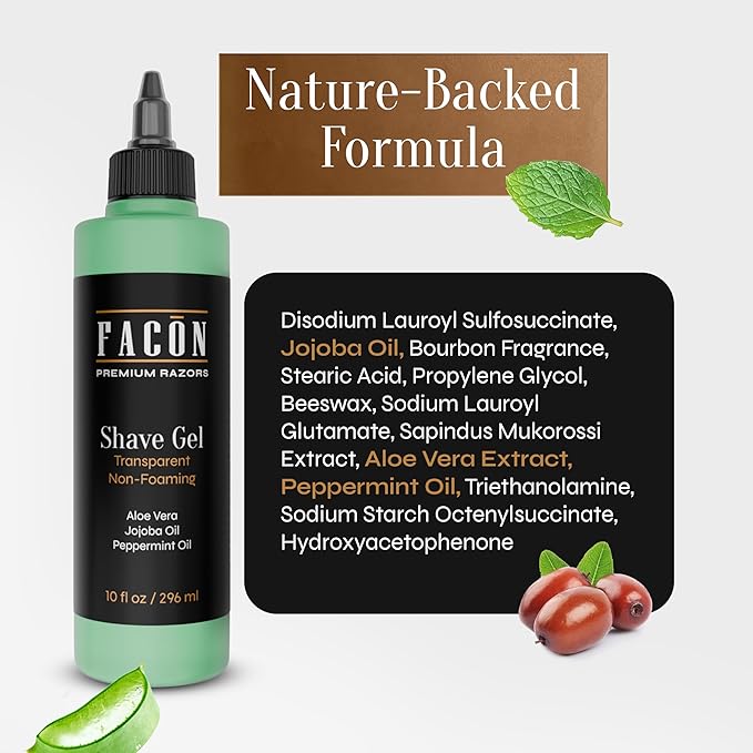 Facón Transparent Shaving Gel for Men with Aloe Vera, Cooling Menthol, Peppermint & Jojoba Oil Scent – Clear Non Foaming Straight Razor Shave Gel, Barber Shaving Gel to Prevent Razor Bumps, 10 fl oz