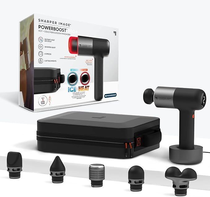 Sharper Image® Powerboost® Pro+ Hot & Cold Deep Tissue Massage Gun - 6 Speeds, 6 Attachments, 5-Hour Battery, Travel Case, Charging Base, Shoulder & Back Massager, Pain Relief Tool, FSA Eligible