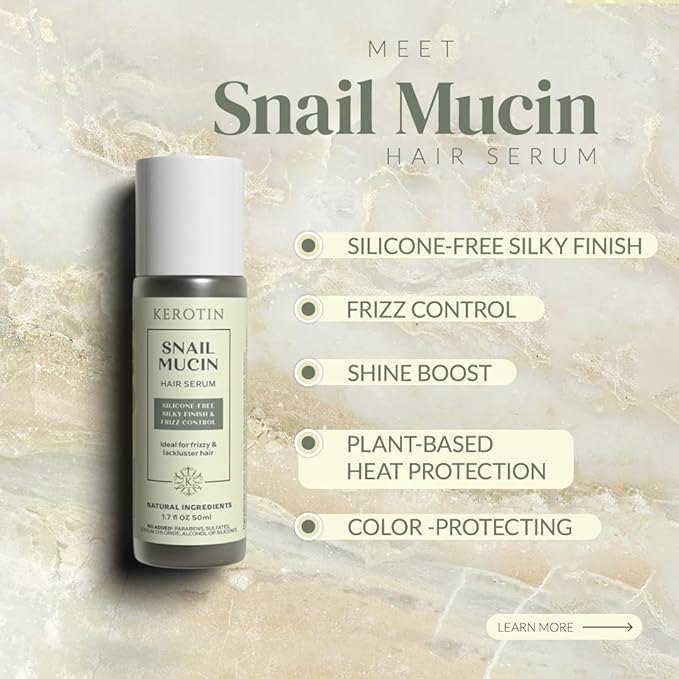 Kerotin Snail Mucin Hair Serum - Silky Finish & Frizz Control. Natural Ingredients. Silicone free heat protection, CGM approved, plant based color protection Ideal for lackluster hair.