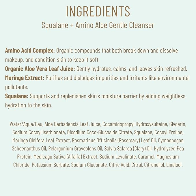 - DEEPLY CLEANSE AND REFRESH: Biossance Squalane + Amino Aloe Gentle Cleanser is your go-to foaming face wash, effortlessly breaking down makeup and impurities. Its unique amino acid complex targets stubborn dirt while keeping your pores clear from environmental debris, ensuring your skin feels fresh and rejuvenated with every use.
