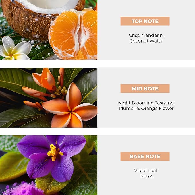 - KEY NOTES FOR A UNIQUE EXPERIENCE: Embark on a sensory journey with key notes of Crisp Mandarin, Coconut Water, Night Blooming Jasmine, Plumeria, Orange Flower, Violet Leaf, and Musk.