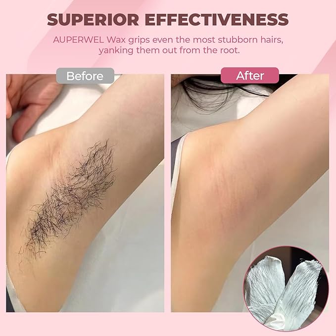- Effective Hair Removal Result: Whether you believe it or not, our wax beans for hair removal are born to remove both coarse and fine hair. Auperwel wax beads for brazilian waxing have no issues getting 90% of hair whether it's the thin stuff on your upper leg or the more stubborn hairs on the bikini area. It hugs EVERY hair securely to pull them from the root and enjoy 3-6 weeks of flawless!