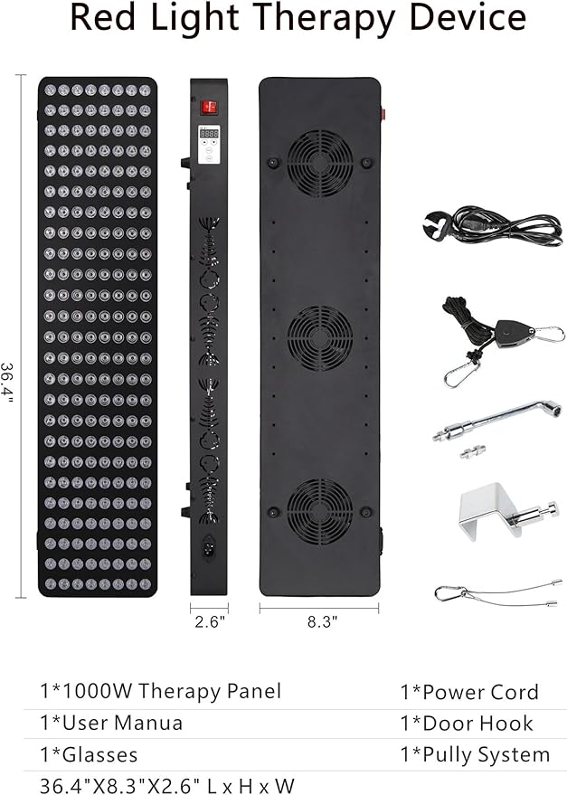 - ️Core Parameter & Accessories of Red Light Therapy Devices for Whole Body: 200 Clinical Grade LEDs, 5W each, total 1000-WATT, Dual-Chip: 200 Red & 200 Infrared lights, Beam angle 30°. Size: 36.4"X8.3"X2.6",Net weight:16.5 LB. Actual Power 260W. The package includes a high-quality 1000W therapy panel, User Manual, buckle, a door mount, protective glasses, screw driver and adjustable hanging kit.