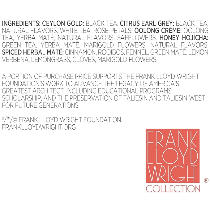 - GROUNDING TEAS make up this distinct colleciton and is expertly crafted to pay homage to the iconic architect. From robust classics to spiced warming blends, each tea evokes a connection to nature, beauty, and tradition.