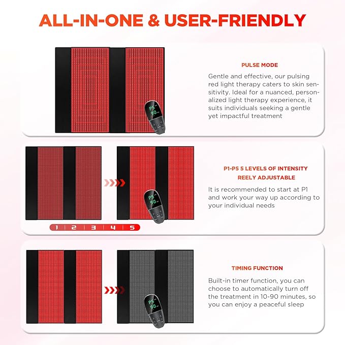 - RED LIGHT THERAPY FOR BODY: Ease pain with ADVARAYS red light therapy blanket. Targeted wavelengths penetrate deeply, soothing aches and promoting healing. Rediscover joy, bidding discomfort farewell for a revitalized, pain-free lifestyle. Target back, neck, knee, and face, relieving tension and enhancing well-being. Effortlessly manage sessions with timer & brightness controls, customizing duration (10-90 mins) and intensity (50W-200W) for a user-friendly boost to your self-care routine