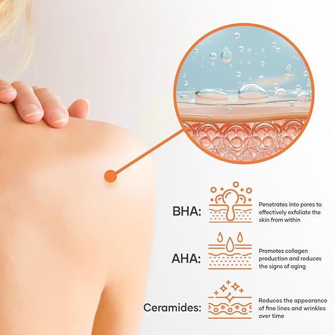 - Exfoliating Body Wash -- Dual Action Exfoliation, combines the power of BHA and AHA, formulated to exfoliate and rejuvenate skin, targeting rough and bumpy skin, keratosis pilaris (KP) and helps acne, body wash salicylic acid for all skin types.