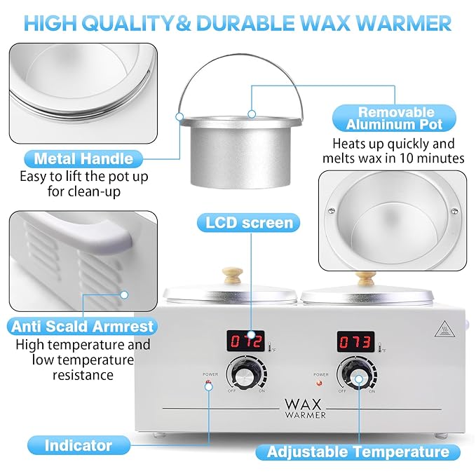 - 【Ideal Home Wax Heater】: You can finish the full body hair removal process at home, perfectly solve the body hair problem and making you look more clean and sexy. The dual pots allow it to melt two different types of wax simultaneously. It is an ideal home essential and easy to operate, just buy it for your family!