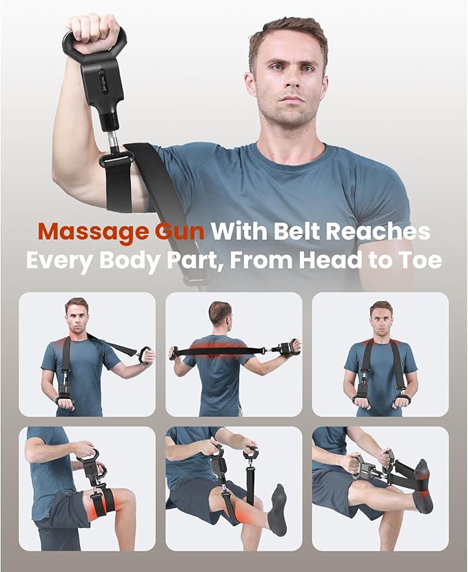 - Dual-Mode Powerful Therapy (Deep Precision + Large-Area Relief): Innovatively combines "massage gun" and "massage strap" dual modes: The massage gun (vertical percussion) penetrates deeply to target muscle knots, quickly dissolving lactic acid; the massage strap (lateral vibration) gently kneads large areas to boost circulation and soothe tight muscles. Effectively relief post-workout soreness in thighs and calves, stiff shoulders/neck/back from desk work, or fatigued arms from housework.