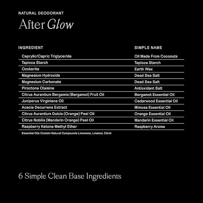 - After Glow - This scent reminds us life is delicious, and full of golden hour walks. Meanwhile, plush tapioca starch and conditioning coconut oil give this sensitive skin deodorant a smooth glide.