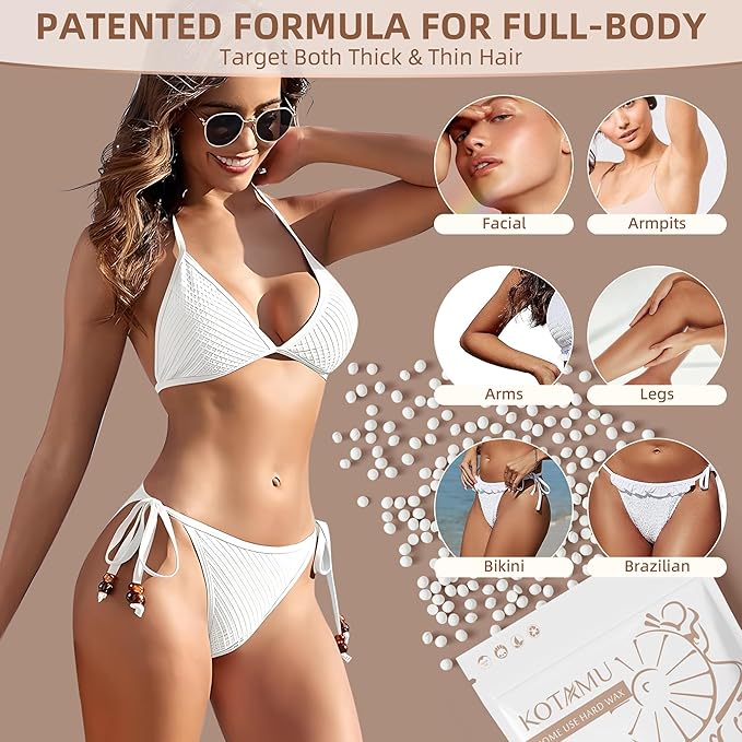 - Effective Hair Removal for All Body Parts: KOTAMU hair removal wax beads target both thick & thin hairs from various body parts, including the arms, face, bikini area, Brazilian, underarms, chest, back, stomach, beard, legs, and more. Regular use thins hair, reduces waxing frequency, and enhances skin's smoothness. Achieve salon-quality results across all these areas, making it the perfect all-in-one waxing solution for every part of your body