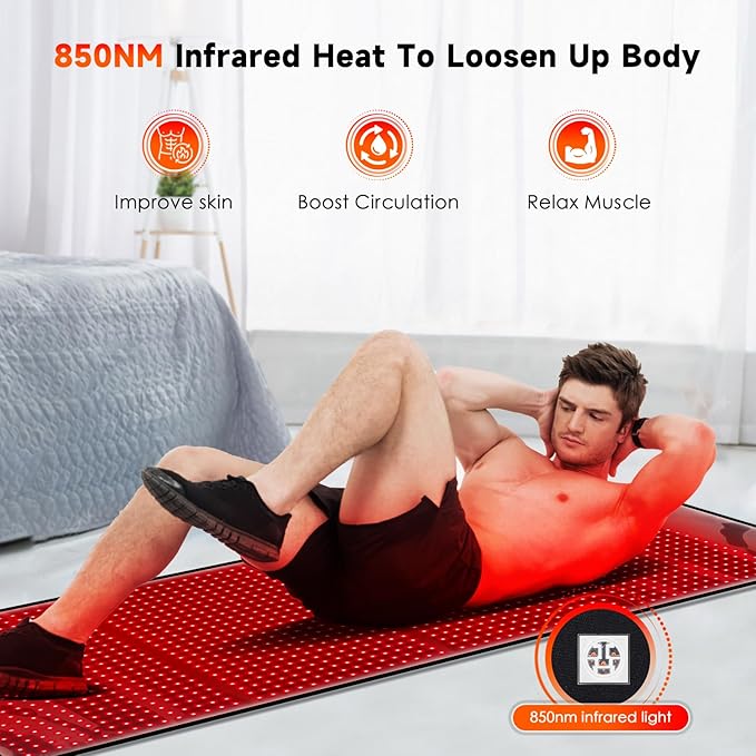 - 🌈1440 LEDS LARGE SIZE RED LIGHT THERAPY MAT: Experience true relaxation with our 67*24 inches large-sized mat. Unwind after exercise while enjoying the benefits of red light therapy for body, providing a convenient, non-addictive solution for muscle and joint care. Incorporating 15-30 minutes of daily red light therapy for face and body promotes firmer, more elastic skin, effectively diminishing wrinkles for a rejuvenated appearance.