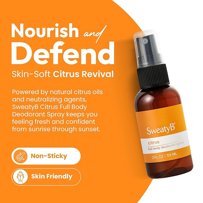 SweatyB® deodorant spray - Odor Protection with whole body deodorant for women & men - Travel Size, Skin-Safe, Vegan & Made in USA - Citrus body spray - 2 Oz