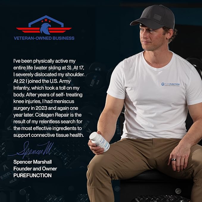 - THE PUREFUNCTION STORY - After years as an athlete and serving in the U.S. Military, Spence (founder) faced serious knee and shoulder injuries that led to multiple joint surgeries and a turning point in his health. Refusing to let pain and setbacks define his future, he dedicated himself to researching the most effective therapies, recovery protocols, and supplements to repair and protect his joints. That journey led to the creation of Collagen Repair—a science-backed formula designed to help others stay active, mobile, and doing what they love.