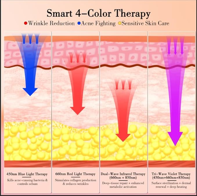 - 【4-Wavelength Professional Phototherapy System】This LED face mask delivers clinically-proven light therapy with four targeted wavelengths (450nm blue, 660nm red, 850nm near-infrared, and purple) to address multiple skin concerns simultaneously. Our advanced light matrix penetrates deep into skin layers to combat acne, reduce inflammation, stimulate collagen, and rejuvenate tired skin - all in convenient at-home treatments.