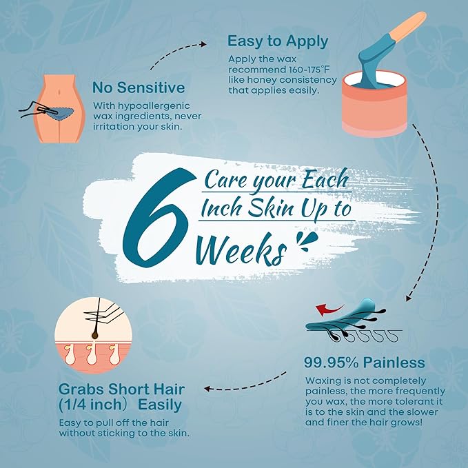 - Salon Results, Home Convenience: Experience salon-like results with hot wax hair removal in the comfort of your home. Our easy-to-use hard wax beans are perfect for beginners, providing long-lasting hair removal without strips, lasting up to 6 weeks - much longer than shaving
