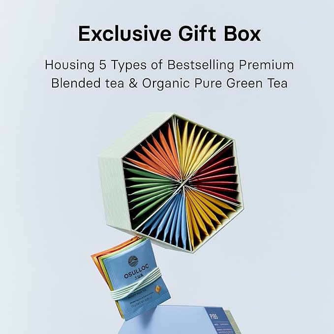 - [Alluring Variety for Daily Delight] Discover a new favorite every day with OSULLOC's VARIATION ESSENCE tea set, consisting of 6 distinct flavors. Savor the diversity of Korea's finest teas with each meticulously curated tea bag, ensuring a unique and refreshing experience with every cup. Containing pure organic green tea, Beloving black tea, and aromatic blended tea.