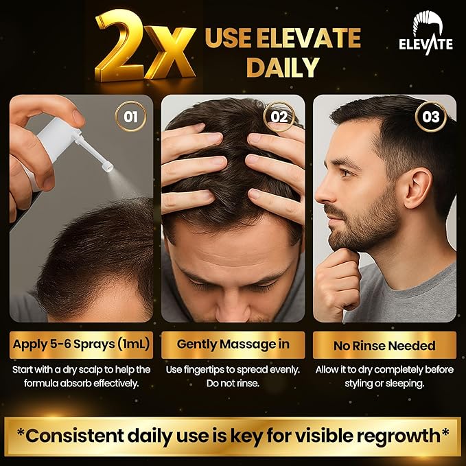 - Easy, Mess-Free Daily Application You’ll Actually Use: Unlike greasy serums or foams, Elevate’s lightweight minoxidil spray absorbs fast and leaves no residue. Apply 6 sprays twice daily for maximum scalp penetration and consistent regrowth results.