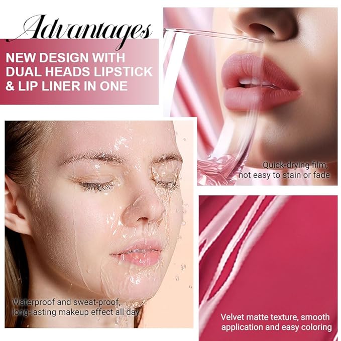 - 【2 IN 1 Lip Liner & Liquid Lipstick】The double ended design made you can use lipstick and lip liner on both ends. New design with dual heads lipstick & lip liner in one, for draw delicate lip line before applying lipstick. It combines lip line and liquid lipstick and makes double-end lipstick more perfect,meets the need of all occasions.