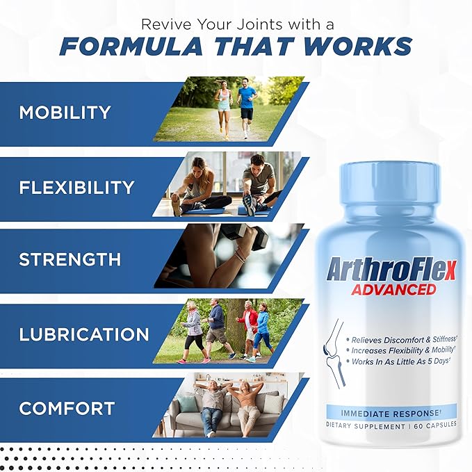 - COMPREHENSIVE 5-IN-1 JOINT SUPPORT FORMULA: Discover the advantages of joint supplements for men and women with ArthroFlex Advanced, designed for those facing joint discomfort and in need of mobility enhancement. This joint support supplement combines the advantages of Type II Collagen, Turmeric Curcumin, Boswellia Serrata to target mobility, flexibility, strength, lubrication, and comfort. It’s natural formula supports cartilage health, reduce stiffness, and enhance overall joint function.