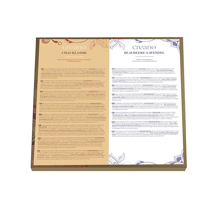 - Creano Organic Tea Mix Gift Set is a unique blend of the different organic tea varieties: Rosemary-Lemon, Morning Tea, Chai Classic, Blueberry-Lavender, Cocoa-Vanilla, Earl Grey Special
