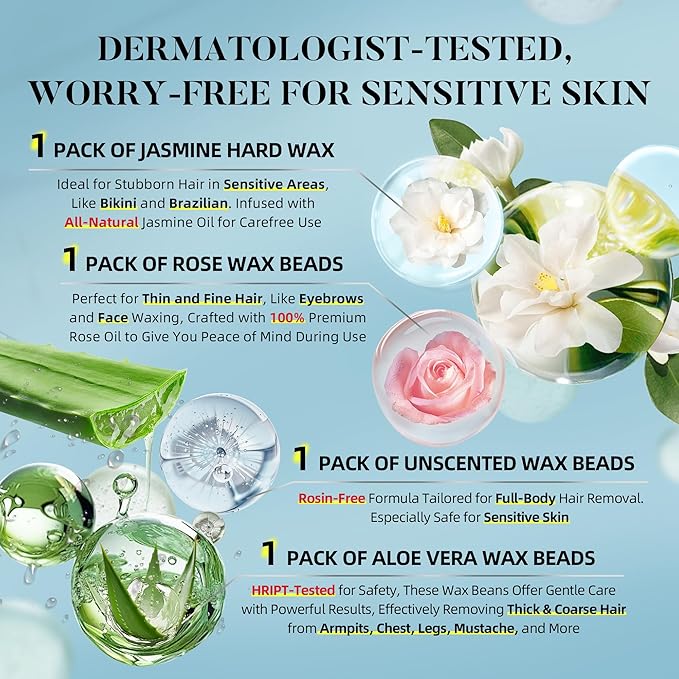 - 【Natural Ingredients, Sensitive Skin Safe】Infused with natural plant extracts like jasmine oil, aloe vera, and rose, our brazilian wax kit for women has successfully passed dermatological testing. The gentle formula of waxing beads minimizes skin redness and irritation and is ideal for sensitive areas like the bikini line, Brazilian area, and underarms—it's the perfect choice for all skin types