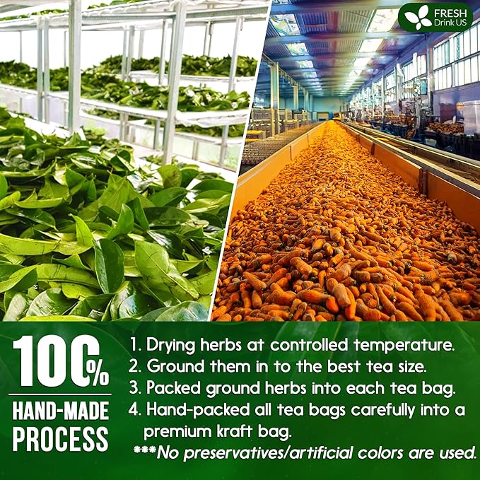 - ☘️ SOURSOP TURMERIC TEA BAGS MADE BY A HAND-MADE PROCESS: Soursop Leaves and Turmeric are picked at their flavorful/colorful peak and naturally sun-dried and roasted to perfection. We hand-select only the premium herbs for the utmost quality. Then we grind them into the best tea size. Next, we immediately pack it in eco-friendly tea bags. Lastly, we pack the tea bags into food-grade kraft bags for ultimate freshness.
