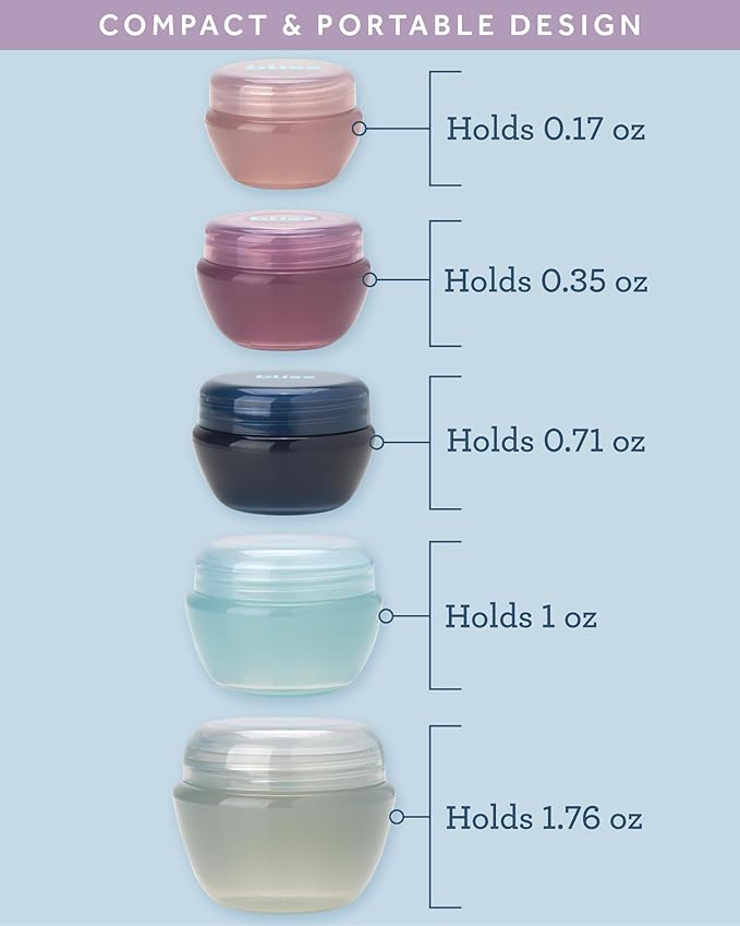 - AUTHENTIC BLISS: Five Assorted Size Wide Mouth Polypropylene Small Travel Containers for Women and Men; Empowering everyone to achieve a higher state of happy through taking care of ourselves, each other, and the environment-one self-care moment at a time.