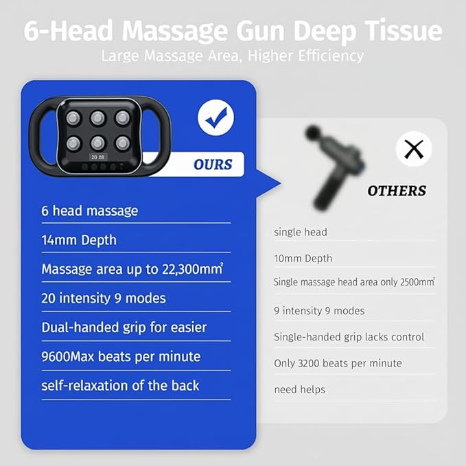 - 6-head Massage Gun: Handheld deep tissue massager, 6-head powerful power, efficient and large area, the massage head relaxation area reaches 22300mm2. The percussion massage gun can percuss 160 times per second, with an amplitude depth of 14 mm. High-frequency vibration can deeply relax the fascia, quickly help you relieve stress, fatigue, lack of sleep and muscle pain, and bring a deep relaxation experience.
