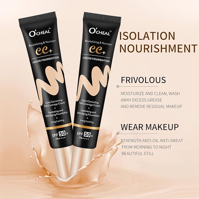 O'CHEAL CC Cream with SPF 50+, Hydrating Color Correcting Cream Full Coverage Lightweight Powder Foundation, Waterproof Long Lasting Pre-makeup Primer Facial Concealer Refine Skin Texture (Ivory)