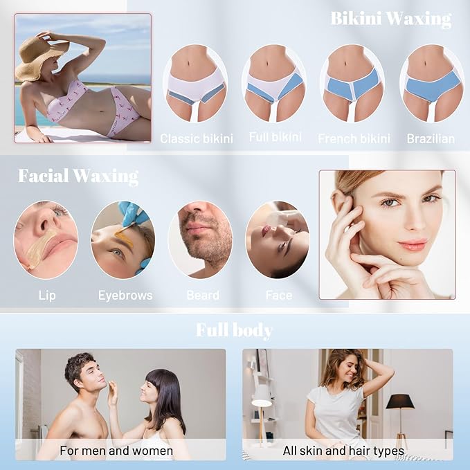 - Ideal for All Areas & Hair Types:Versatile and effective, wax beads for Brazilian waxing work on delicate areas like the face, eyebrows, upper lip, armpits, and bikini line, as well as larger zones like the legs, arms, chest, and back. No strips needed—just melt, apply, and remove! Perfect for both women and men, this hard wax for hair removal ensures a clean, painless experience every time