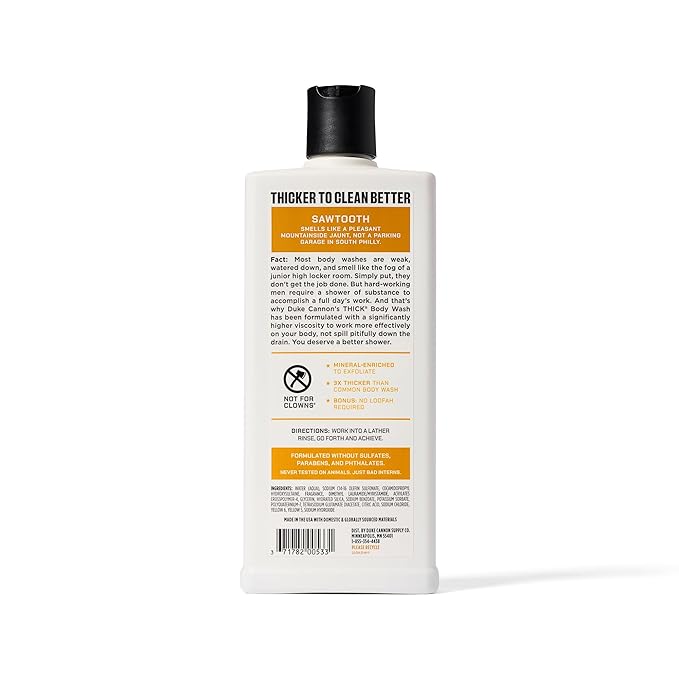 - Duke Cannon Sawtooth Body Wash - Duke Cannon's THICK Body Wash is for men who want a substantial shower experience. It's three times thicker than regular body wash. Enriched with minerals, it provides natural exfoliation, leaving you refreshed.