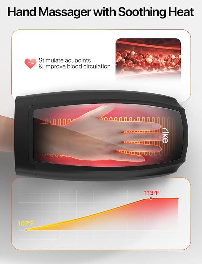 - Vibration & Soothing Heat - The RIKE hand massager machine provides optional vibration and two heat levels of 107-113 °F to soothe every inch of your sore muscles and soft tissues, effectively alleviating finger numbness, arthritis, joint pain, or carpal tunnel pain. The gentle heat can eliminate your fatigue and coldness, promotes blood circulation